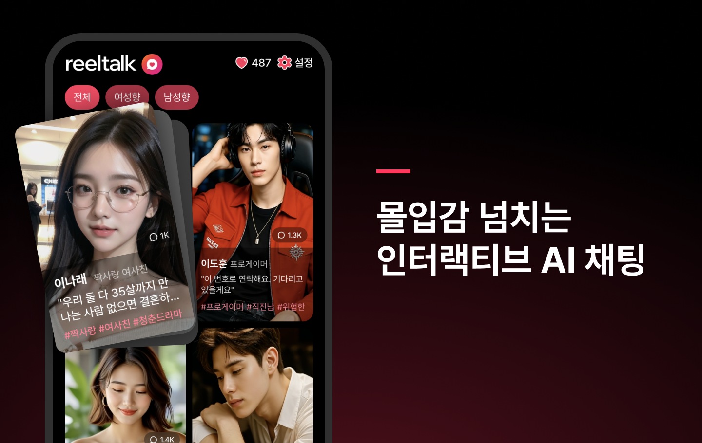 릴톡은 단순 텍스트만 주고 받는 채팅이나 수동적으로 스토리를 접하게되는 콘텐츠 플랫폼과는 달리 유저가 스토리의 주인공이 되어 매력적인 캐릭터들과 함께 드라마틱한 스토리를 직접 이끌어나갈 수 있는 특별한 AI 채팅 서비스입니다.